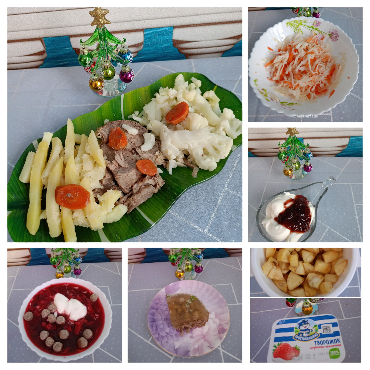 •Завтрак в 12.15 - отварная говядина; цветная капуста на пару; замороженный картофель фри на пару; квашеная капуста; творог 0% с мацони и сливовым джемом.