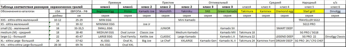 ‼️‼️‼️‼️ Рубрика вопрос ответ: Какой керамический гриль нам подобрать? Готовую матрицу Мы нашли только у BGE. Поэтому ‼️‼️‼️‼️‼️ Мы подготовили удобную таблицу соответствия размеров керамических грилей, основных брендов, которые возможно приобрести у нас в России. И составили рейтинг наш субъективный. А Какой Ваш выбор? Ответы в комментариях Что является Важным фактором при выборе керамического гриля? Размер — ключевой параметр. Для 4-6 человек чаще всего выбирают гриль диаметром 18-22 дюйма (45-55 см). Материал и качество — толстые стенки из жаропрочной керамики лучше держат тепло и служат дольше. Комплектация — обратите внимание на систему подъема крышки, качество термометра, материал решеток (нержавеющая сталь предпочтительнее) и наличие полезных аксессуаров (дефлекторы, камни для пиццы) Таблица соответствия размеров керамических грилей. XXS - eXtra eXtra маленький ø 10-12 in 25-29см XS - eXtra маленький ø13in 30-32см small (S) - маленький ø16in 33-33,5см medium (M) - средн