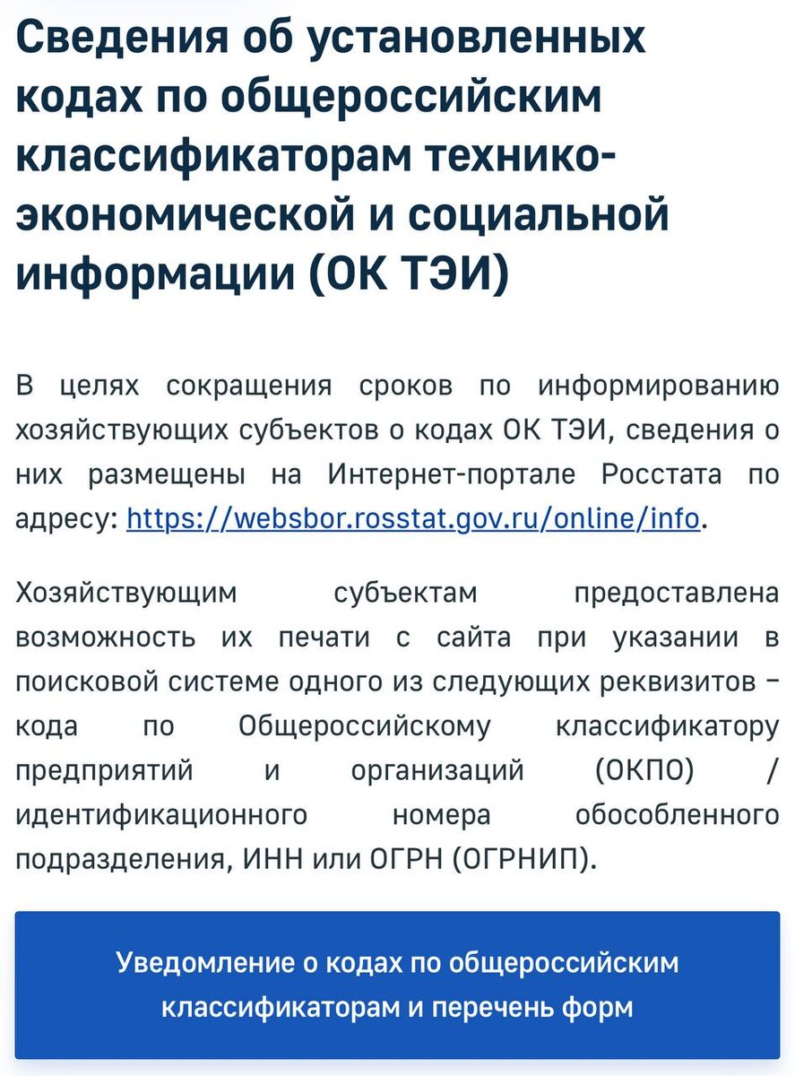 >>> «Уведомление о кодах по общероссийским классификаторам и перечень форм»