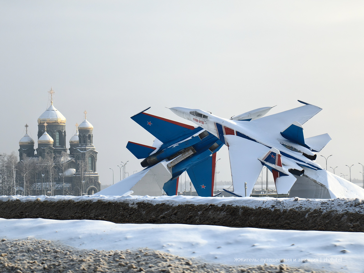 Увидеть самолёты прославленной пилотажной группы «Русские Витязи» можно в любой день. Для этого не нужно ждать авиашоу или получать пропуск на военные аэродромы. Достаточно просто проехать по Минскому шоссе. Памятник «Русским Витязям» установили рядом с парком «Патриот» на 55-ом километре трассы М-1 «Беларусь» весной 2023 года. Увидеть его можно из окна машины или автобуса, даже не заезжая в главный военно-патриотический комплекс страны. Два истребителя Су-27 совершают один из сложнейших элементов высшего пилотажа — «встречный роспуск». За счет того, что машина движется, ракурс постоянно меняется, и кажется, что это самолеты проносятся мимо. Истребители Су-27 — это первые самолеты, на которых выступала группа высшего пилотажа ВВС России. В 2016 году «Русские витязи» получили сверхманевренные истребители Су-30СМ, а в 2019-2020 годах Су-35С. Сейчас летчики пилотируют на них. «Русские витязи» — единственная пилотажная команда в мире, выполняющая групповой высший пилотаж на тяжёлых ис
