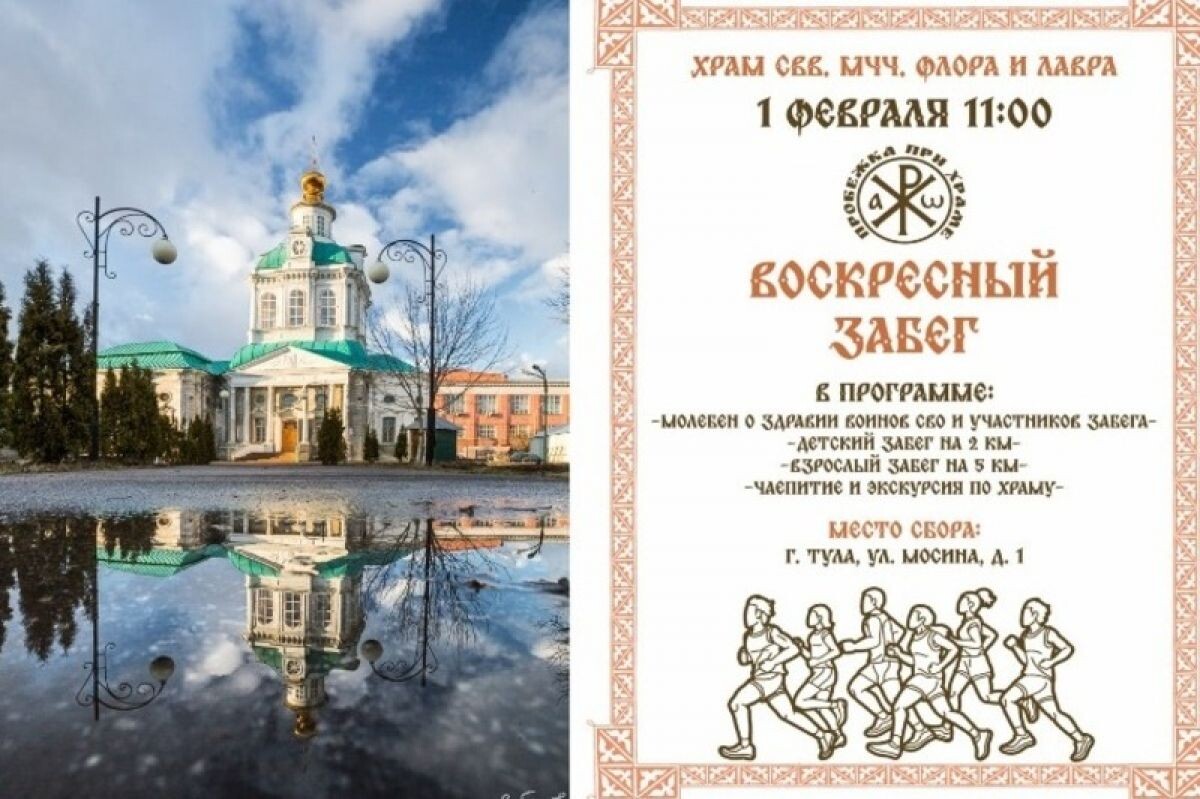 Тула, вдохновившись опытом соседей из Орловской области, проведет свою «Пробежку при храме» 1 февраля. Об этом сообщили наши коллеги из «Орловских новостей». В оружейную столицу прибудут представители Орловской епархии: руководитель спортивной комиссии иерей Василий Лях и его помощник Константин Сальников. Сбор всех желающих начнется в 11 часов дня у храма Святых мучеников Флора и Лавра, расположенного по улице Мосина, 1. Мероприятие начнется с молебна о здравии российских военнослужащих пред образом святого Ильи Муромца, затем участники пробегут 2 или 5 км После финиша запланирована экскурсия по храму, а также чаепитие с горячим сербским чаем, тульским пряником и угощениями для всех участников.