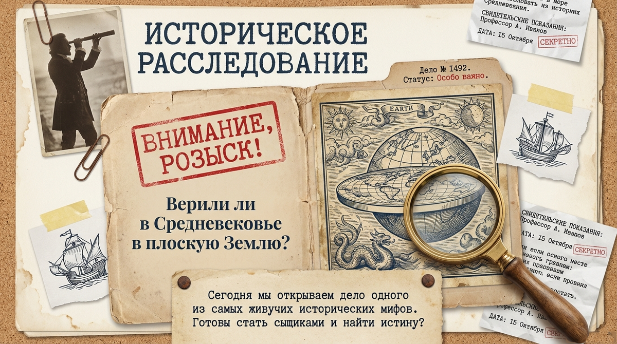 В эфире — спецвыпуск исторического расследования! Сегодня мы берёмся за дело, которое будоражит умы уже два столетия. Наш главный вопрос, который висит в воздухе: Правда ли, что в Средневековье все поголовно верили, будто живут на плоской тарелке, боясь упасть с края? Готовы ли вы вместе со мной найти улики, допросить свидетелей и вынести окончательный вердикт? Тогда надевайте мысленные плащи сыщиков — мы начинаем!