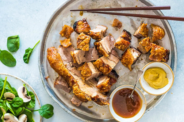 Если вы уже готовили Красная тушеная свиная грудинка председателя Мао, то вы знаете один стиль: кусочки свинины сначала берут карамель, потом час спокойно тушатся в соевом соусе со специями, а в конце соус уваривается до блестящей глазури. Здесь — другая философия. Грудинка не «плавает» во вкусе — вкус строится снаружи: сухая кожа, соль, воздух духовки и три режима запекания, которые вытапливают жир и превращают шкурку в хрустящую корочку. Это кантонская классика: запечённая свиная грудинка со знаменитой хрустящей шкуркой. В домашней духовке она отлично получается, если соблюдать логику из трёх шагов: соль на кожу маринад Выбираем правильный кусок Сушим кожу и делаем насечку ромбиком Если уйти глубже, из насечек начнёт выходить жир и сок — и там, где влажно, хруст всегда хуже. Маринуем так, чтобы кожа осталась сухой Коже нужно подсохнуть — это напрямую влияет на будущую корочку Запекание в три этапа Режим: 200°C — 30 минут затем 150°C — 2 часа затем 230°C — 30–45 минут, до уверенной хр