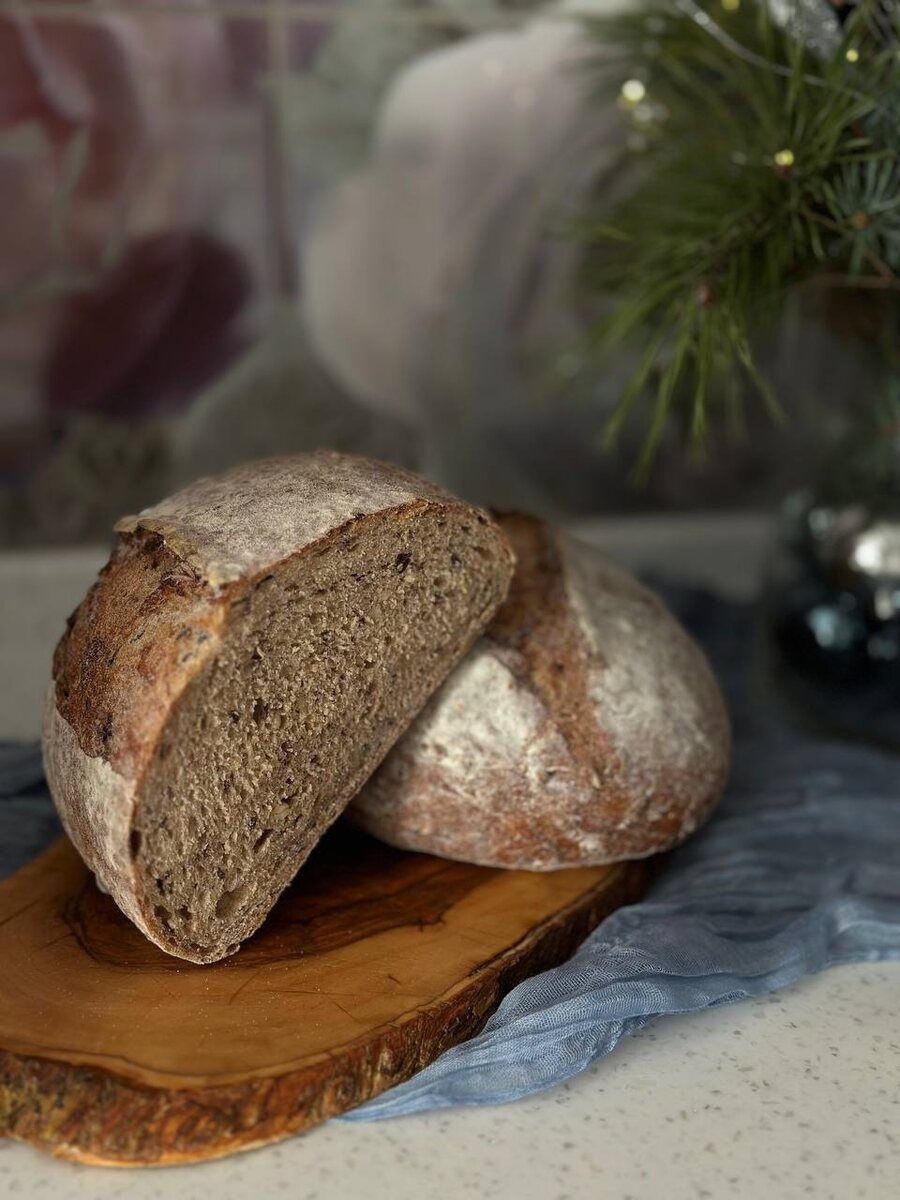 🌲🌲 ХЛЕБ ДЕРЕВЕНСКИЙ ЦЕЛЬНОЗЕРНОВОЙ С СЕМЕЧКАМИ. Хлеб получился шикарный! 🍪 ДЕРЕВЕНСКИЙ ЦЕЛЬНОЗЕРНОВОЙ ХЛЕБ С СЕМЕЧКАМИ Опара: 150 гр воды 120 гр пшеничной муки 25 гр пшеничной закваски 100% влажности Смешать, накрыть, оставить на 12 часов при комнатной температуре. Мочка: 215 гр воды 45 гр семян льна 45 гр семян подсолнечника 45 гр семян тыквы 45 гр кунжута белого ( семена все обжарить) Затем замочить минимум на 4 часа Тесто: Вся опара Вся мочка 20гр. Псиллиум( шелуха подорожника) 500 гр пшеничной цельнозерновой муки 380 гр пшеничной муки в/с 380 - 500 гр воды ( зависит от муки) 30 гр меда ( сахара) 18 гр соли Все смешать до гладкого однородного состояния. Оставить на 2 часа при температуре 23-25 градусов Сделать две обминки с интервалом 30 минут. Оставить на 2 часа бродить, затем убрать в холодильник на ночь. Можно сразу сформовать заготовки,дать выбродить ещё 2 часа и выпекать! Утром сформовать две заготовки. Расселять ещё часа 2-3. Выпекать при 250С с паром 10 м