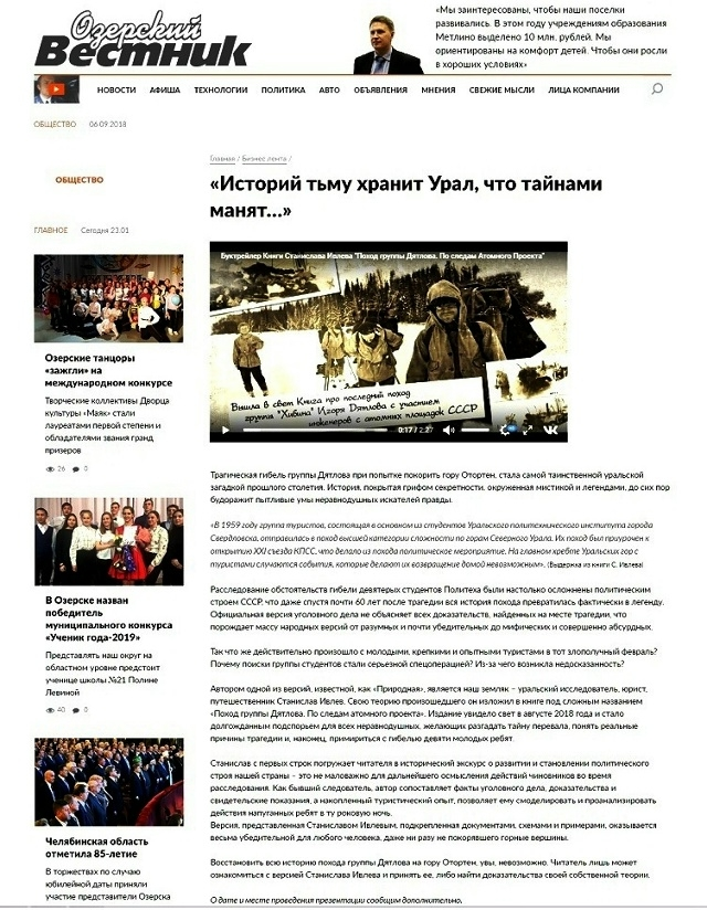 Об этом походе и участии в нём озерчанина жители Озерска и других уральских городов, прежде всего жители ЗАТО, стали узнавать из публикаций в СМИ. Газета "Озерский вестник", портал "Ураловед", Трёхгорный "Спектр", Екатеринбургский портал "Е1" писали отрывки про исследование озерчанина Станислава Ивлева о походе группы Дятлова. После публикаций в Дятловедении была сделана поправка. Георгия - Юрия Кривонищенко уже не считали работником Маяка, поскольку "почтовый ящик 404" -это всё же обозначение Строительства, которое на Южном Урале с декабря 1945 года возводило комбинат Маяк. Наш земляк, приехавший в 1957 году в атомград после окончания УПИ, работал на объекте "Озеро" (непосредственно строительство городских зданий и сооружений) с бригадой заключённых, который принимали в строительстве Озерска и комбината участие наравне с военными стр