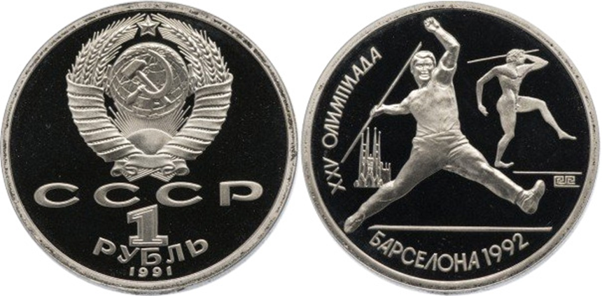 - Описание монеты – 1 рубль 1992 года «Метание копья. Игры XXV Олимпиады. Барселона. 1992».