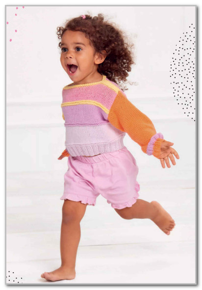 Перевод из журнала "Kinder MASCHENMODE", № 1, 2026 г. Этот симпатичный пуловер быстро вяжется из пяти цветов. Ряды, выполненные платочной вязкой, подчеркивают полоски лицевой глади. Мягкий хлопок идеально подходит для детских пуловеров. Модель для начинающих