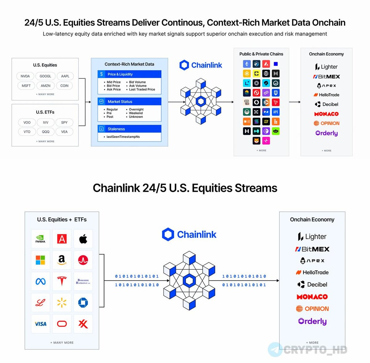 Запущены стримы данных по американским акциям и ETF – информация по фондовому рынку теперь доступна в ончейн 24/5, включая премаркет и постмаркет. Работает на 40+ блокчейнах. По сути, можно торговать американскими акциями, пока традиционные биржи «спят». Lighter, BitMEX, ApeX, Orderly Network и другие уже интегрировали решение для своих RWA-рынков. Crypto Headlines