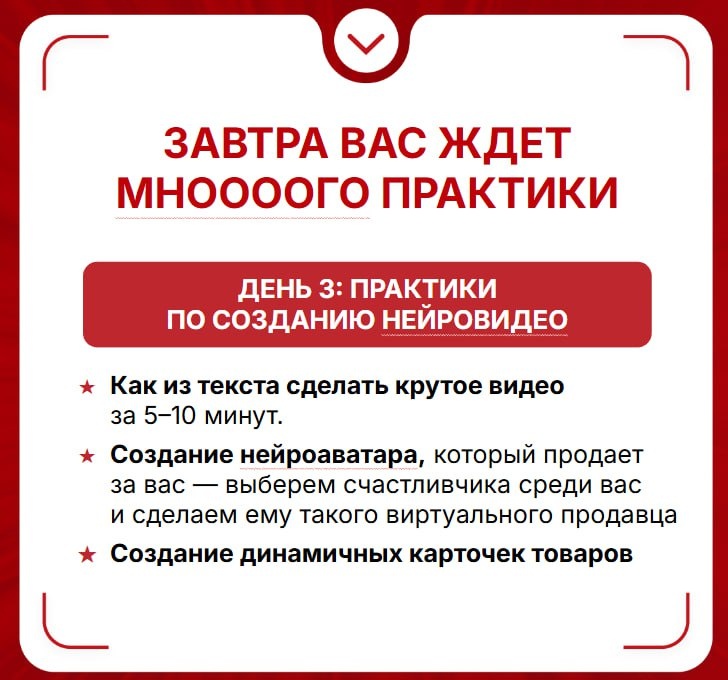 📌📌📌📌Завтра — 3-й день курса «Клиенты и деньги в нейросетях 2026» в 19.00 мск. И будет много практики. День про нейровидео — без «я так не умею». Спокойно, пошагово и с результатом. Что будем делать: — разберём, как из обычного текста сделать крутое видео за 5–10 минут — покажу процесс создания нейроаватара, который может продавать и объяснять за вас — среди участников выберем счастливчика и сделаем ему виртуального продавца прямо в эфире — создадим динамичные карточки товаров, которые можно использовать для соцсетей, сайтов и маркетплейсов Это день, после которого видео перестаёт быть чем-то сложным и страшным и становится рабочим инструментом. Завтра будет плотно: минимум теории — максимум действий. Не пропустите.