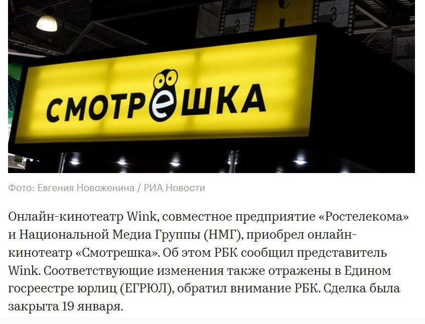 Ростелекома: Теперь все 100% в уставном капитале ООО «ЛайфСтрим» (юрлица «Смотрёшки») принадлежат ООО «Рестрим Медиа» (юрлицу Wink). Ранее компания была в собственности у основателей — гендиректора Александра Киселевича (89%), а также Тимура Родионова (7.25%) и Георгия Юфа (3.75%). «Смотрёшка» — компания, которая оказывает услуги онлайн-кинотеатра и предоставляет сервисы интернет-телевидения для локальных российских интернет-провайдеров. Сервис работает через посредников, которыми для него в основном выступают операторы ШПД регионального уровня. «Для нас это выход в новый перспективный и растущий сегмент рынка: мы приобретаем игрока с выстроенным бизнесом и лояльной клиентской базой», — прокомментировал сделку глава Wink Антон Володькин. Он добавил, что благодаря сделке компания получит «новых уникальных и платящих подписчиков с хорошими перспективами дальнейшего роста базы». Стоит отметить, что Смотрёшка, имеющая собственную абонентскую базу, раздаёт сигнал огромному количеству мале