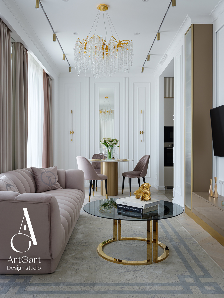 Умело использовали пространство под гостиную и столовую, а кухню разместили в нише. В гостиной разместили круглый обеденный стол, большой диваном и тв зону. Владельцы хотели место для хранения декора и мелочей, поэтому мы установили два стеллажа, закрытых рифленым стеклом. Когда включена подсветка, это выглядит очень красиво. Зона телевизора оформлена молдингами и оснащена подсветкой, а тумба бронзовая. Вся гамма помещения пыльно-кофейная с бронзовыми вкраплениями. Гостиную от спальни отделяет рифленая стеклянная перегородка, что помогает сохранить пространство и при желании превратить его в открытую студию. Мы использовали все возможные приемы увеличения пространства, в том числе много зеркал. Стена за столовой зоной оформлена самой разной лепниной, молдингами, зеркалами и бра – многослойная и интересная декоративная композиция. Кондиционеры скрытые, канальные, видны только прорези в карнизах для прохождения воздуха.