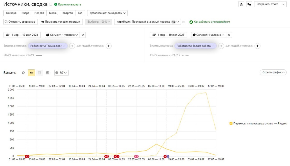 Как вам такая накрутка поведенческого фактора? Жесть, да? Надо понять и принять простую вещь, что накрутка поведенческого фактора – это черный метод seo-продвижения. Добросовестные исполнители никогда не используют накрутку ПФ в качестве базиса продвижения (разве что чуть-чуть). Именно в качестве базиса, блин! Повторил, чтобы, некоторые маркетологи не начали выпендриваться. Запомните, сайт можно поднять в органической выдаче без накрутки ПФ (если конечно все ваши конкуренты не крутят ПФ тоже). Если уж и крутить ПФ, то это надо делать совсем чуть-чуть и чтобы поисковая система не распознала ботов. Приняла их за реальных пользователей. А для этого нужно уметь правильно их нагуливать. А еще такой большой объем искусственных пользователей создают дополнительные проблемы. Например, из-за большого количества сессий коллтрекинг не может точно определить источник звонка, что ведет к искажению статистики. Или, например, сложнее оценить реальный процент отказа пользователей, сложнее анализирова