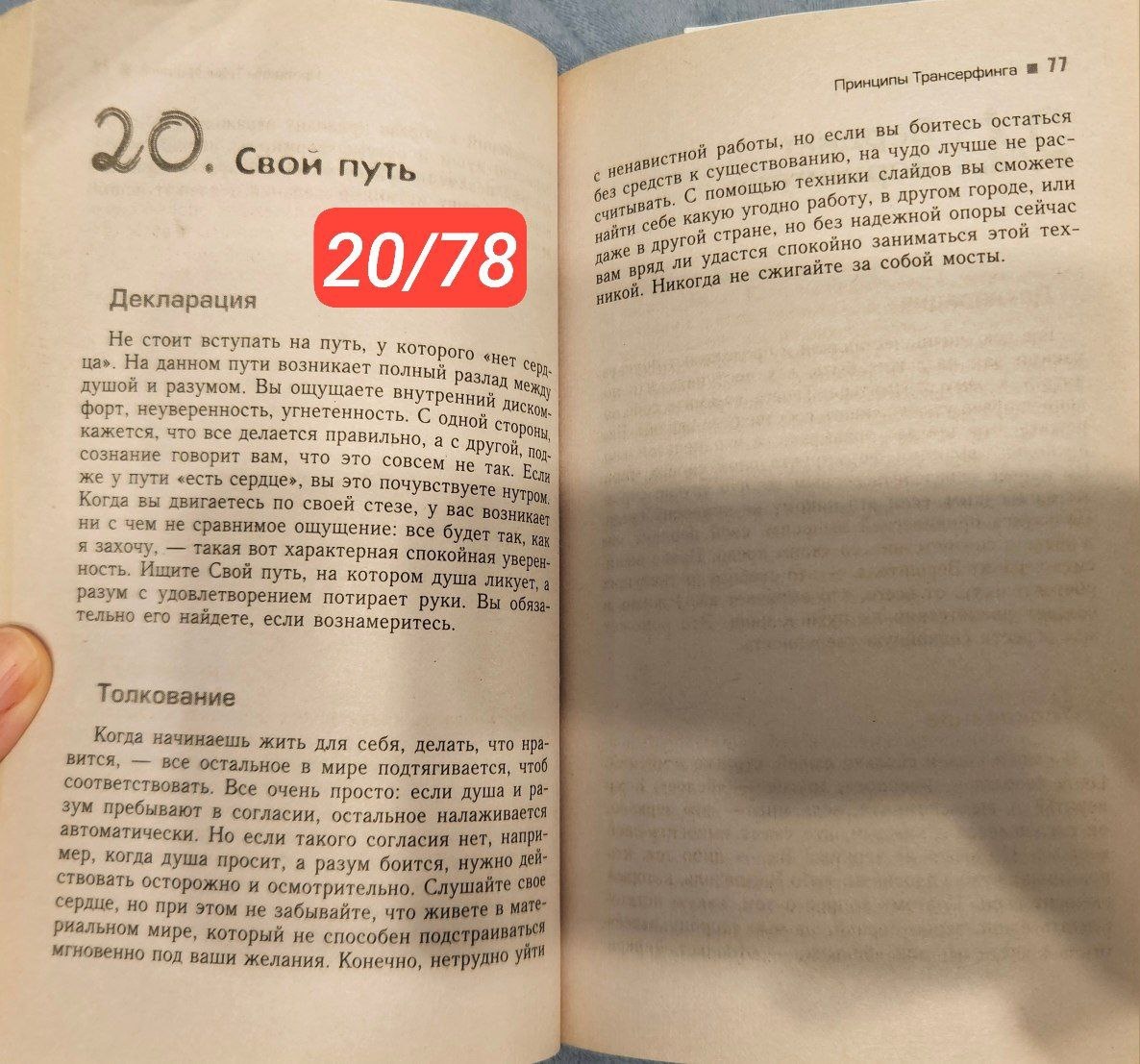 20/78 Практикум управления реальностью - Трансерфинг Свой путь "Не стоит вступать на путь, у которого "нет сердца". На данном пути возникает полный разлад между душой и разумом. Вы ощущаете внутренний дискомфорт,неуверенность, угнетенность. С одной стороны, кажется, что все делается правильно, а с другой, подсознание говорит вам, что это совсем не так. Если же у пути "есть сердце", вы это почувствуете нутром. Когда вы двигаетесь по своей стезе, у вас возникает ни с чем не сравнимое ощущение: все будет так, как я захочу, - такая вот характерная спокойная уверенность. Ищите свой путь, на котором душа ликует, а разум с удовлетворением потирает руки. Вы обязательно его найдете, если вознамеритесь." "Когда начинаешь жить для себя, делать, что нравится, - все остальное в мире подтягивается, чтоб соответствовать. Всё очень просто: если душа и разум пребывают в согласии, остальное налаживается автоматически. Но если такого согласия нет, например, когда душа просит, а разум боится, нужно де