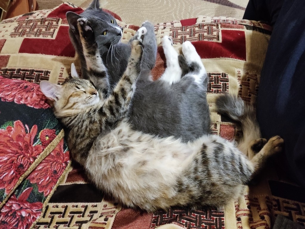 У нас кошка Марфуша исполняет белый танец "Дамы приглашают кавалеров". А если кавалеры не хотят? Отказы она не принимает. Я ещё не встречала такой приставучей кошки. И хорошо, что объектами своего внимания Марфуша выбрала не меня. Она постоянно пристает к нашему Тихону и к моему мужу. Мужа она постоянно облизывает, а Тихона, судя по всему, скоро окончательно задушит в объятиях. Помнится я рассказывала про рыжего Барсика, который всех кусал. Всех. Без разбора. И я шутила, что такого приставучего кота - ещё поискать. Читайте также: Конфетница КОТ с разинутым ртом (д) Но правду говорят, что всё признается в сравнении. Поскольку появилась Марфа Васильевна и двух представителей мужского пола (мужа и Тихона) она окончательно замучила. Постоянно к ним лезет. И со своей "любовью" уже не дает им малейшего прохода. Муж по несколько раз в день её отпихивает. Хотя никогда прежде он себе такого ни с одним котом или кошкой не позволял. А тут он говорит: "Ну это невыносимо! Она меня уже своим шершавы