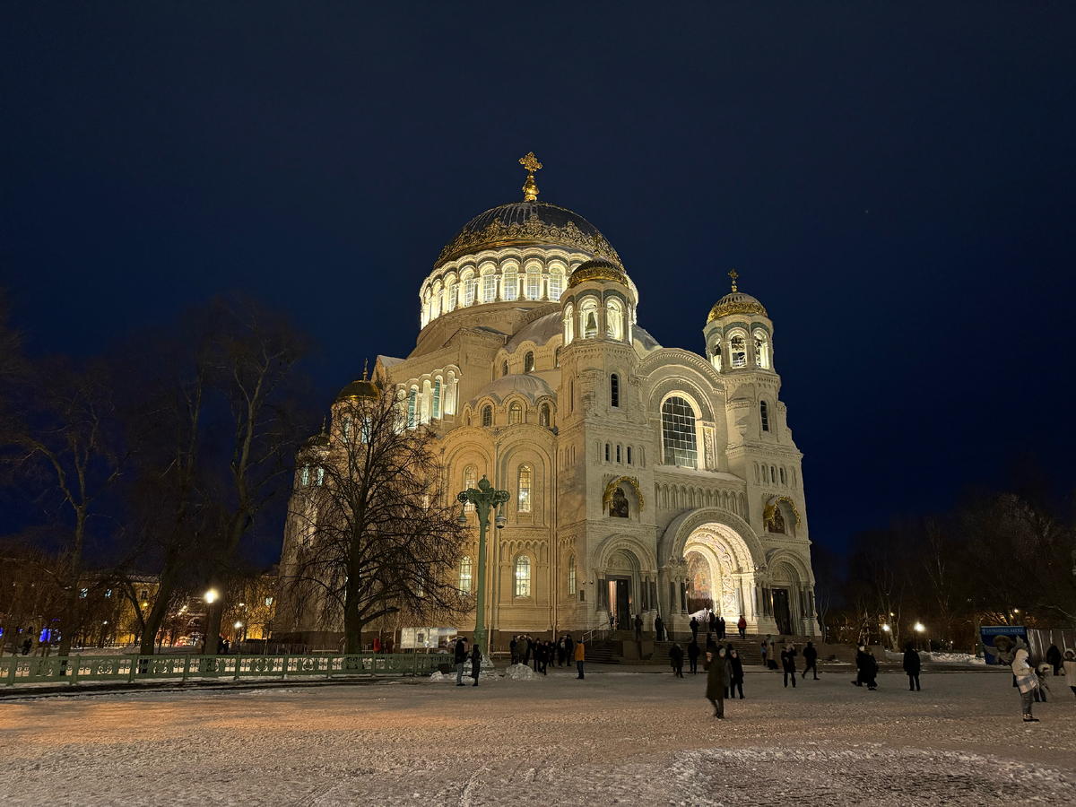 Морской храм, Никольский морской собор в Кронштадте. Пылающий мираж на центральной площади. Кажется, моргнёшь, и это чудо исчезнет, испариться, сдует его в ночную мглу Финского залива. Закрываешь и открываешь глаза. Нет, ты по-прежнему стоишь пред белоснежным звездолётом, в центре которого огромное око-иллюминатор. И почему считается главным собором Храм Христа Спасителя в Москве? Несмотря на внешнюю громоздкость, внутри него очень тесно, пусто и никчемно. В моём рейтинге Морской собор Кронштадта всегда на первом месте.