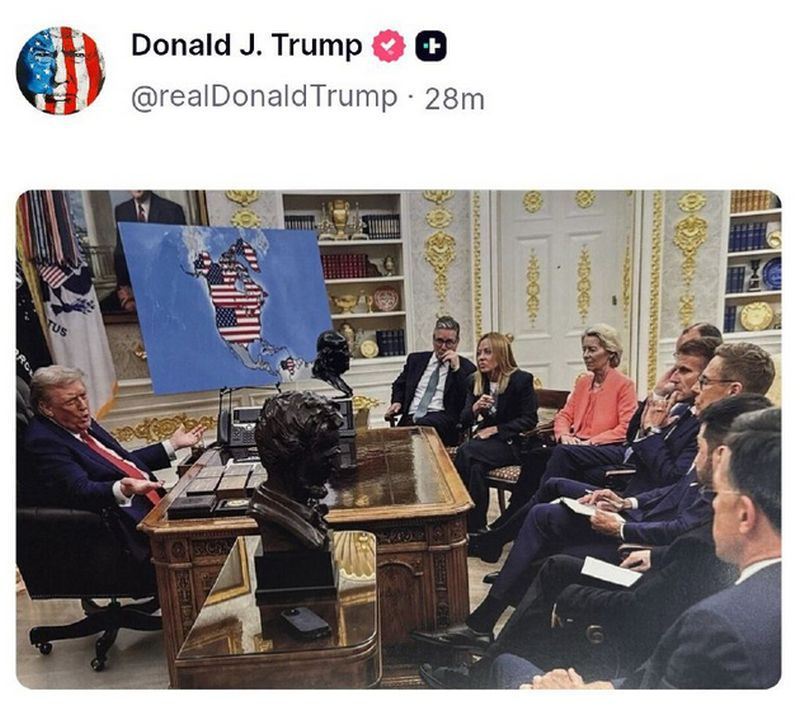 Из новостей: президент США Дональд Трамп в своей соцсети Truth Social опубликовал картинку, на которой он в своём кабинете в Белом доме беседует с лидерами европейских стран. Рядом с ними расположена карта, на которой в цвета флага США закрашены территории Венесуэлы, Гренландии и Канады.