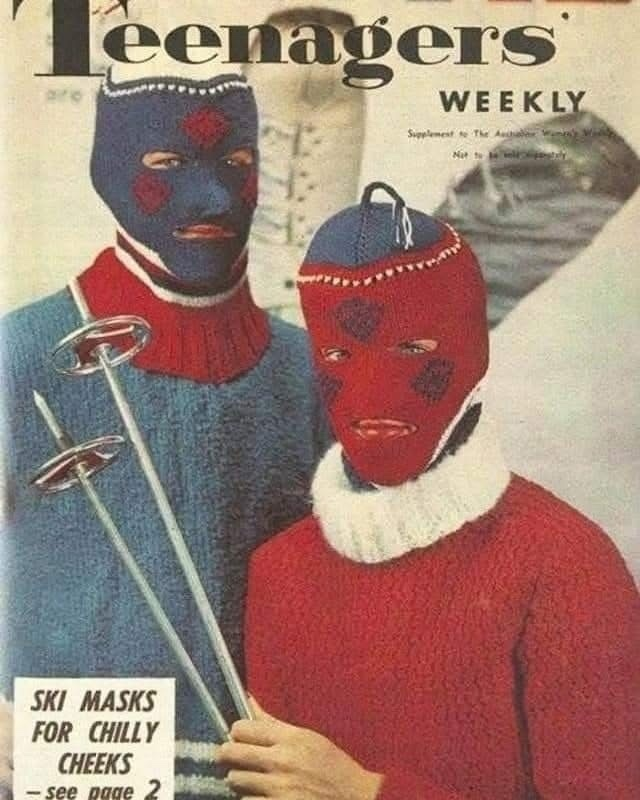 Нет, не фотошоп и не ИИ. Всамделишная обложка журнала (точнее секции большего журнала “Australian women’s weekly”) от 1963 год. Извинения этому безобразию два: в те годы балаклавы в целом еще не ассоциировались с бандитами и террористами и были нормальной частью лыжной одежды (дизайн, правда, в этом случае очень лихой и придурковатый - но он же для тинейджеров!), ну и то, что это австралийский журнал. Что австралийцы понимают в лыжах. ++++++++++++ Поддержите канал подпиской, если вам не трудно. Заранее благодарна! ➦ https://vk.com/club231957380