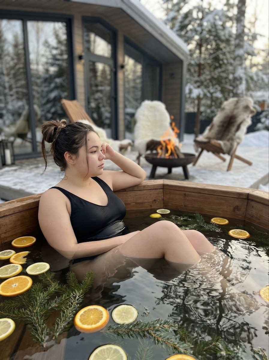 : Не изменять черты лица модели КОМПОЗИЦИЯ И РАКУРС Основная сцена: Женщина полулежит в деревянной уличной купели Поза: опирается локтем о край ванны Купальник: чёрный цельный на бретельках Ракурс камеры: Съёмка сбоку, угол 3/4 Камера расположена на небольшом возвышении Формат изображения: 9:16 (вертикальный) ДЕТАЛИ МОДЕЛИ Причёска: Волосы собраны в небрежный пучок Несколько прядей выпадают естественно Качество проработки: Высокая детализация кожи Фотореалистичная текстура Естественные блики и тени на коже ВОДА И КУПЕЛЬ Деревянная купель: Материал: натуральное дерево Высокая детализация текстуры древесины Уличная конструкция Вода: На поверхности плавают кружочки цитрусовых (апельсин, лимон) Хвойные веточки на воде Лёгкая рябь Отражения деревьев в воде Естественные переливы и блики ОСВЕЩЕНИЕ Естественный свет: Мягкий рассеянный солнечный свет Дневное освещение Теплые приглушённые природные тона Мягкие тени ЗАДНИЙ ПЛАН И ОКРУЖЕНИЕ Сезон: Зима Архитектура: Панорамный дом с терра