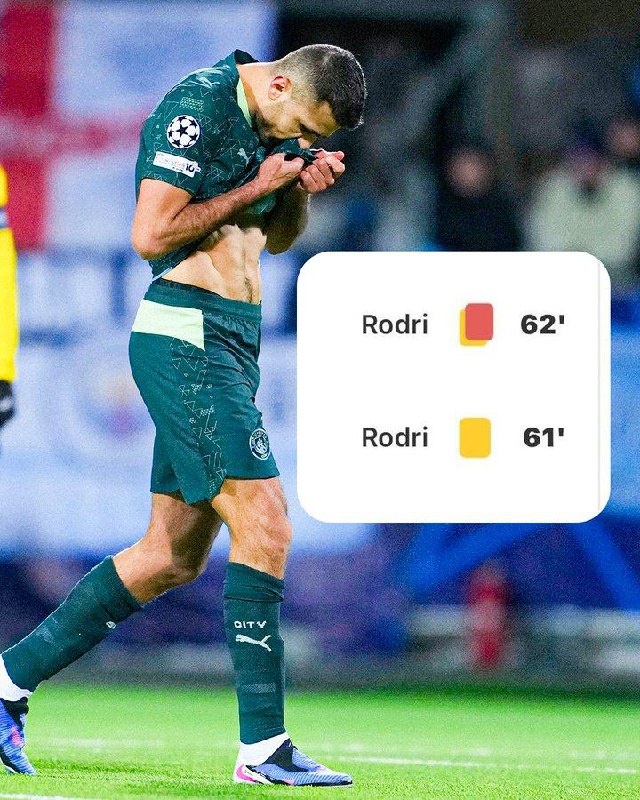 Родри получил две желтые карточки с разницей в 53 секунды, оставив "Манчестер Сити" вдесятером 🟥