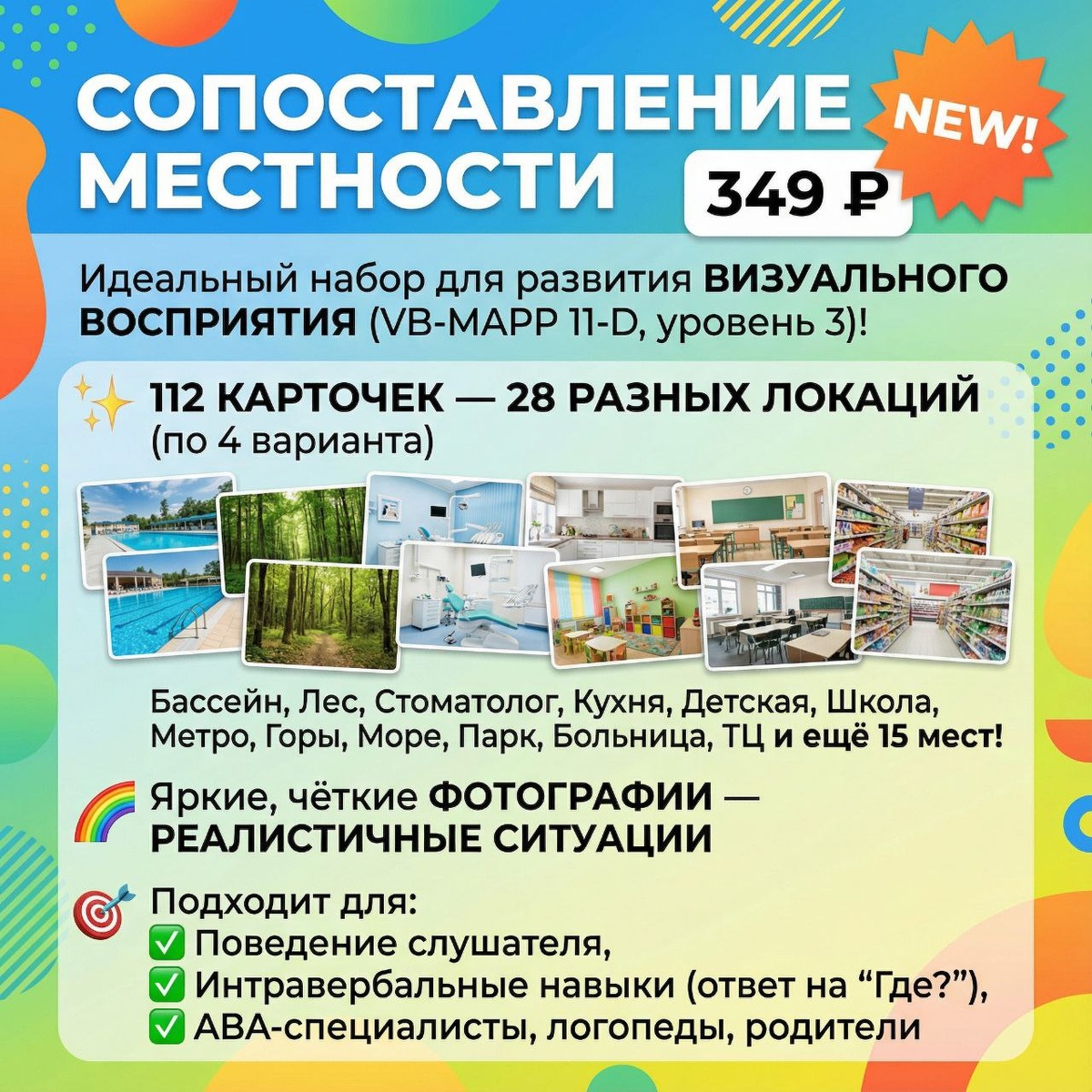 » Идеальный набор для развития визуального восприятия (VB-MAPP 11-D, уровень 3) ✨ 112 карточек — 28 разных локаций, по 4 варианта каждой: Бассейн, аквапарк, лес, стоматолог, кухня, детская, школа, метро, горы, море, парк, больница, торговый центр и ещё 15 реалистичных мест! 🌈 Яркие, чёткие фотографии — не просто картинки, а настоящие ситуации из жизни. 🎯 Подходит не только для сопоставления, но и для: - Работы по поведению слушателя - Развития интравербальных навыков (ответы на вопрос «Где?») Отличный инструмент для АВА-специалистов, логопедов и родителей! Приобрести по ссылке : 🔗 https://payform.ru/kpaqdtr/