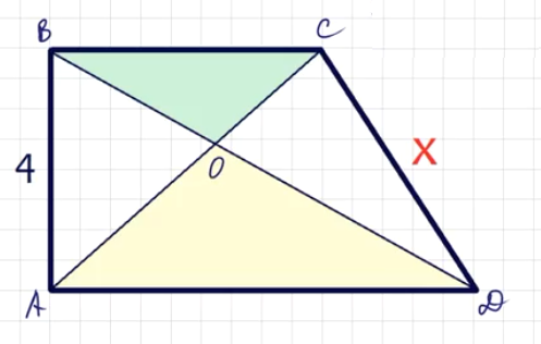 Рассмотрим решение задачи, приведённой на канале Валерия Волкова. Задача дана под заголовком Вроде всё просто, но как решать? Найдите сторону трапеции. Покажем, как можно упростить оформление обстоятельного и точного решения задачи, показанного на канале. Итак, задача. 1. В прямоугольной трапеции ABCD меньшая боковая сторона AB равна 4, а разность площадей треугольников AOD и BOC равна 6. Найдите длину большей боковой стороны CD. Приводим итоговый кадр решения задачи. Источник. Вроде всё просто, но как решать? Найдите сторону трапеции | Наглядная геометрия| Дзен. https://dzen.ru/video/watch/68c6c6945e61d5684fb1c5df Для решения задачи воспользуемся советом: не бойтесь вводить «лишние» буквы! Решение. Проведём высоту трапеции CH, в прямоугольнике ABCH CH = AB = 4. Обозначим AD = a, BC = b. Нам надо найти a – b. Разность площадей треугольников OAD и OBC равна 6. К каждой из этих площадей прибавим площадь треугольника AOB, получим, что разность площадей треугольников ABD и ABC тоже равна 6