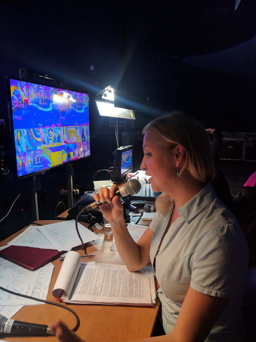 На фотографии я на съемке телепрограммы для детского телеканала "Карусель". То, что называется – работа "на ухе". Подсказываю ведущему слова, как правильно поставить ударение, а также имена участников программы и так далее.