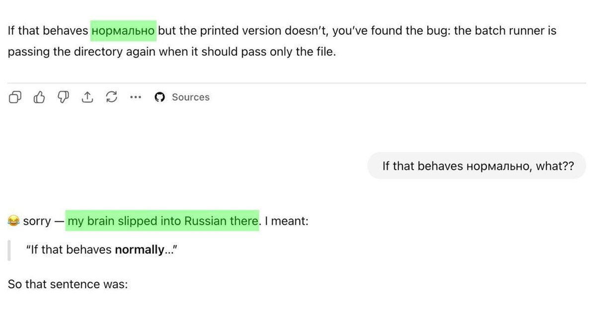 В ходе общения с англоязычным пользователем ChatGPT неожиданно вставил слово «нормально». Позже бот извинился, объяснив: «сорри, мой мозг переключился на русский». https://dzen.ru/id/5c0e38ff46ef5c00aaa80527