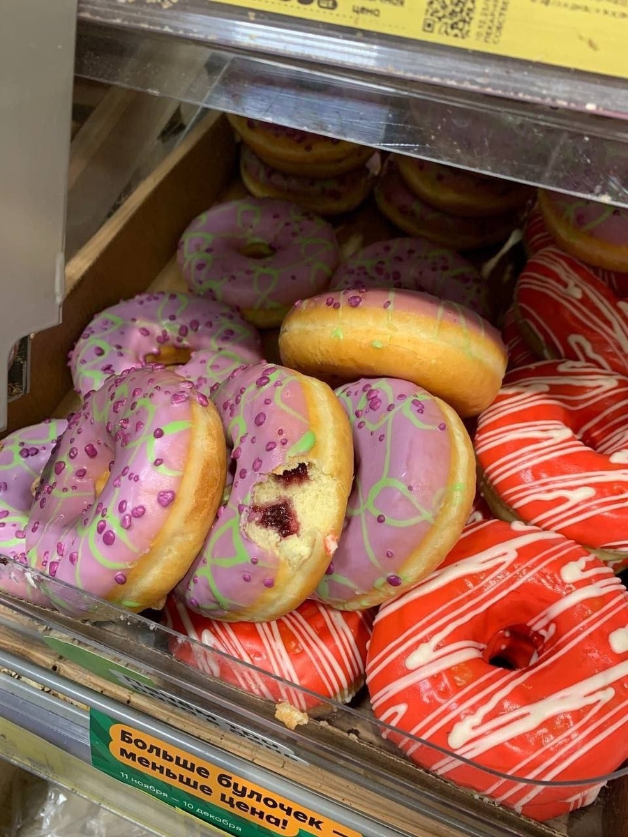 В "Пятёрочке" кто-то откусил пирожное "донат" и положил обратно на витрину