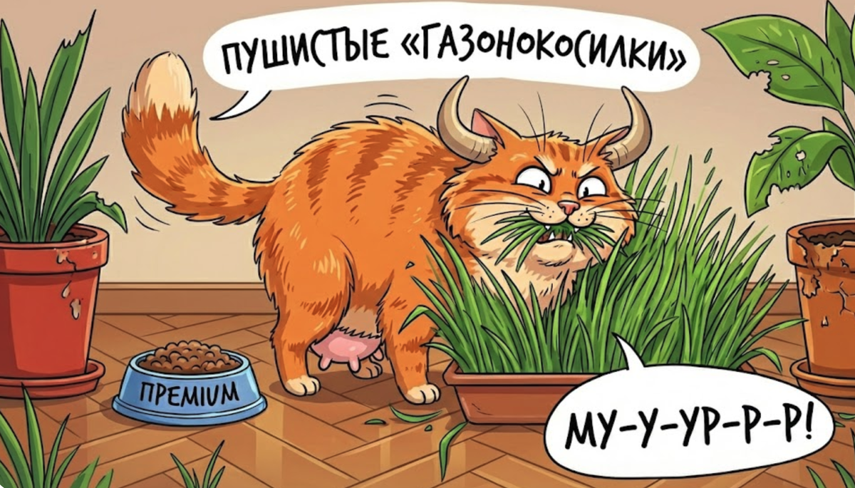 Знакомая ситуация? Вы покупаете коту корм по цене крыла самолета. Выбираете самые нежные кусочки индейки. А этот шерстяной гурман с презрением смотрит в миску, разворачивается и идет... грызть ваш любимый фикус. В этот момент в голове хозяина просыпается бабушка-советчица: «Ой, наверное, Мурзику витаминчиков не хватает, организм требует!» Забудьте. Это один из самых старых мифов о кошках. Если бы ваш кот реально хотел восполнить дефицит витаминов травой, ему пришлось бы жевать её сутками, как корове на лугу. Но кошка — хищник, её желудок просто не умеет переваривать целлюлозу. Трава выходит из кота в том же виде, в котором зашла (уж простите за подробности). Так зачем он это делает с упорством маньяка? Причина куда интереснее и прозаичнее. Кошки — патологические чистюли. Вылизывая шубку, они ежедневно проглатывают огромное количество шерсти. В желудке она не переваривается, а сбивается в плотные войлочные комки — безоары. Если этот комок уйдет дальше в кишечник — будет беда (вплоть до