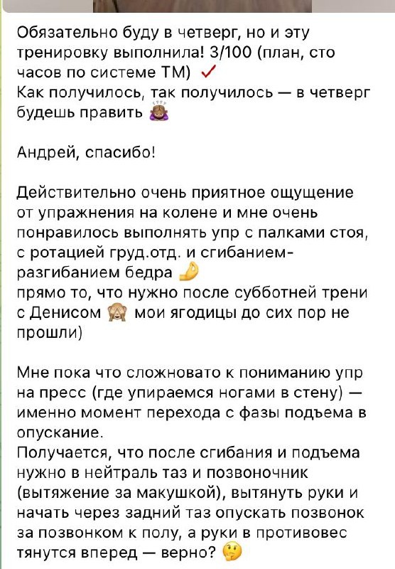 ! Настя в январе зашла в клуб ТМ. Параллельно проходит Базу онлайн, изучает теорию и сразу же практикует в клубе! В феврале идёт на флагман. Сейчас у неё челлендж - 100 часов тренировок на себе. Она занимается в клубе у меня и у Андрея, наблюдает тело, фиксирует изменения, собирает опыт. Кто ещё не в курсе про правило 100 часов? ❤️ - я знаю 🔥- расскажи подробнее