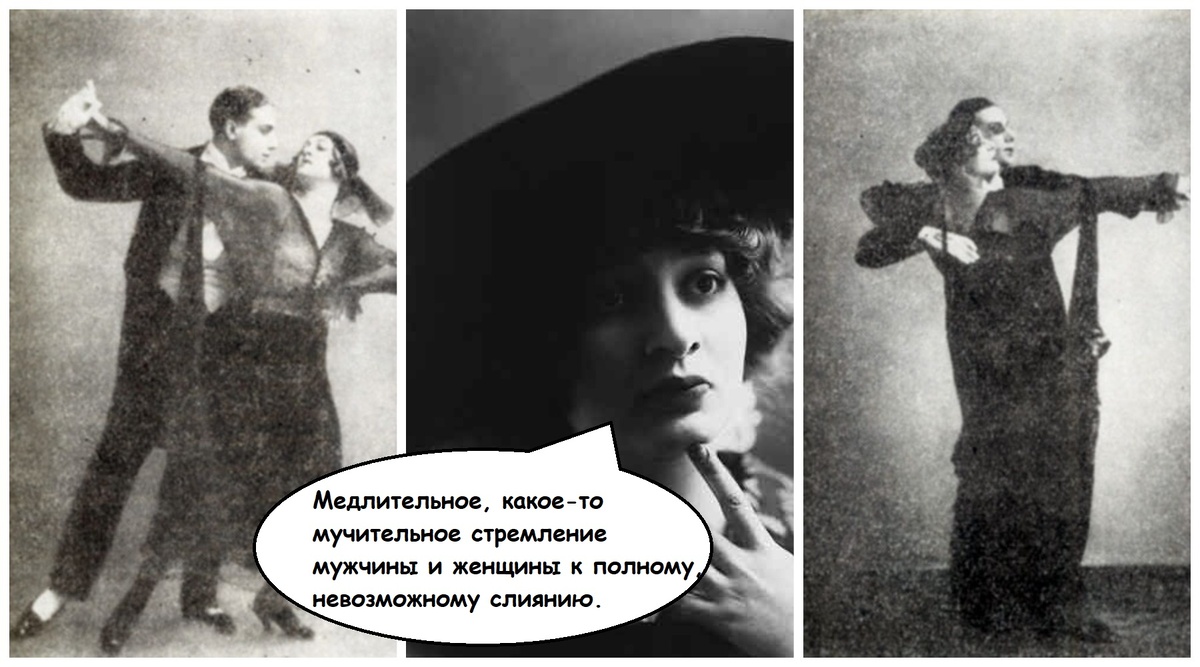 Нашёл интересные воспоминания Нины Серпинской «Флирт с жизнью» о нравах дореволюционной богемы, в том числе о танго. Этот танец пришёл в Россию в 1913 году и имел мало общего с аргентинским. По описаниям современников он был очень нервный и изломанный. И с большим налётом декаданса.