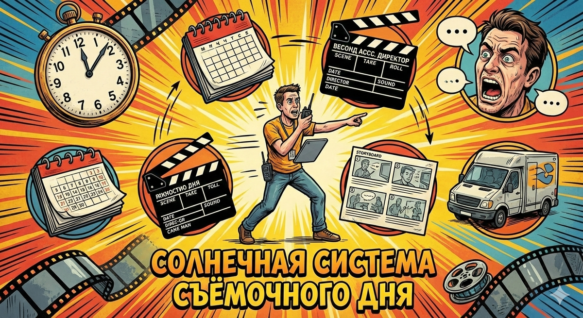 P.S. Разобрались с тем, кто управляет временем. Но кто управляет деньгами на съемочной площадке? В следующем материале — разбор роли линейного продюсера: как он считает каждую копейку сметы, договаривается о скидках и не дает проекту вылететь в трубу. Подписывайтесь, будет жарко!