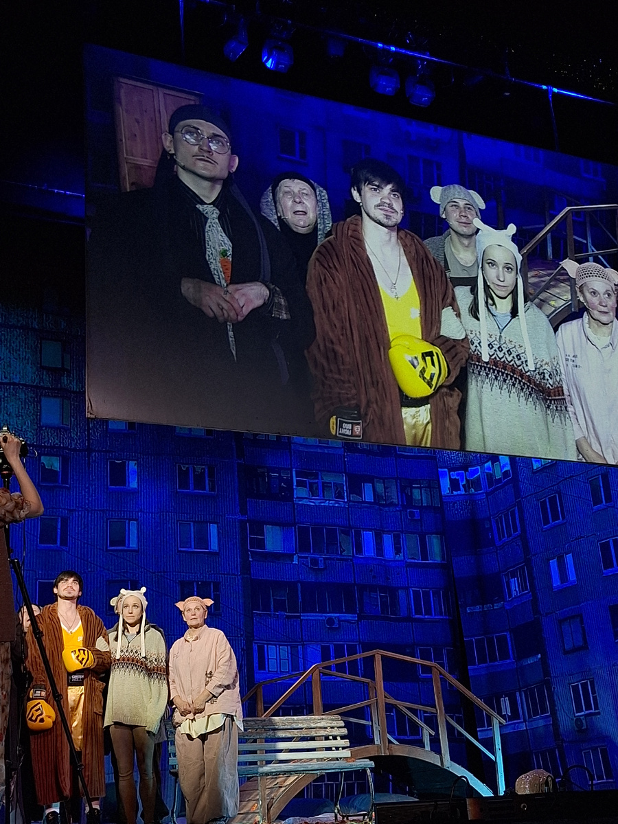 Я в детстве пыталась читать книгу Алана Александра Милна "Винни-Пух и все-все-все", но смотреть отечественный мультфильм про Винни-Пуха или диснеевский вариант было гораздо приятнее) Поэтому на одноименном спектакле Петра Шерешевского в МТЮЗ я, в смысле возраста, остановилась где-то между 8 и 80, как и указано на сайте театра) Я то возвращалась в детство - когда я выходила гулять примерно в такой же двор, что и был на сцене , то переносилась в свое взрослое состояние, где я знаю мемы и фразы из "Слова пацана". Интересно, что зрителей сразу предупредили, что начинают не с начала, а с того места в книге, где остановились. Но совершенно не возникло ощущение, что пропустили что-то важное, наоборот, получилось как в детстве, когда к игре можно было присоединиться в любой момент. Спектакль состоит из нескольких историй и в какое время не начать их слушать, все равно будет интересно. И как в детстве любая вещь идёт в игру: надень колготки на голову и ты уже Кролик; Ослику вместо ушей сгодится серые носки; а чтобы стать Пятачком достаточно надеть розовую шапочку с ушками; а если ты нашел ещё одну пару колготок (те самые советские, непременно коричневые и с коленками) и детские сандали, то ты уже - Крошка Ру! А кусок целлофана за одну секунду превращается в речку или густой туман!