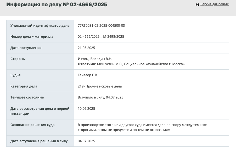 "Охране рыбовЪ" стало известно, что некий гражданин Володин В.Н. подал в суд на другого некоего гр. Мишустина М.В. Но суд дело производством оставил без рассмотрения , потому что где-то там, в каком-то другом суде, уже имелось аналогичное дело по иску Володина В.Н. к гражданину Мишустину М.В. Желающие обсудить как Володин В.Н. поссорился с Мишустиным М.В., могут сделать это в комментариях.