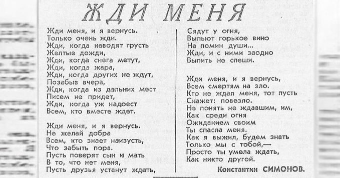 В газете «Правда» опубликовано бессмертное стихотворение Константина Симонова «Жди меня». Жди меня, и я вернусь. Только очень жди #ПамятныеДатыВоеннойИсторииОтечества #ДеньВИстории #ГодЗащитникаОтечества #80ЛетВеликойПобеды Источник: https://vk.ru/wall-216215303_2844 Подпишитесь на наши группы ВКонтакте, в Одноклассниках, в Телеграм - читайте, смотрите и комментируйте информационные материалы, предлагайте свои! Источник: Открыть
