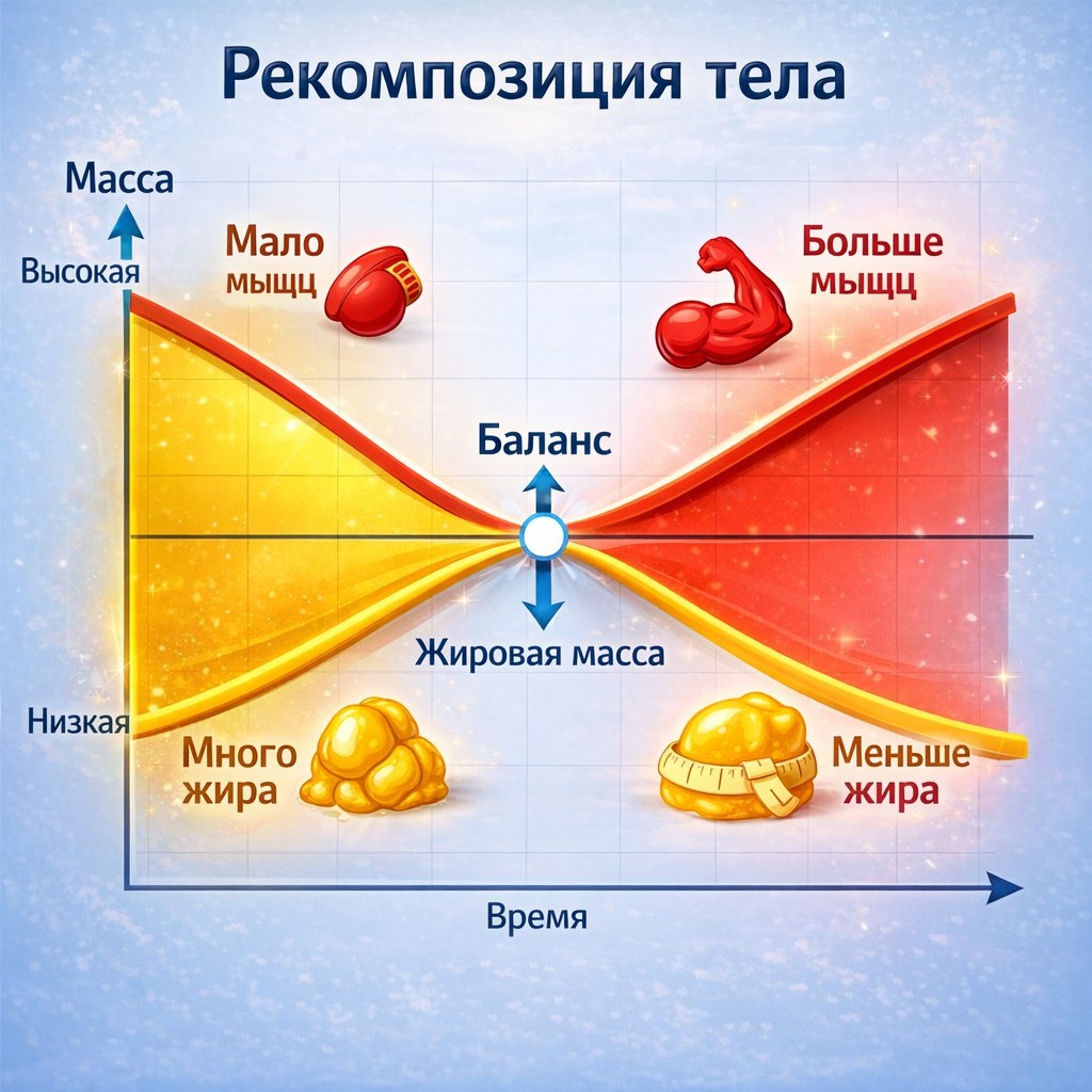 Рекомпозиция тела - это процесс, который заключается в одновременном снижении жировой массы и увеличении мышечной. Это задача не из легких, но с правильным подходом и мотивацией – вполне реальная. В этой статье мы узнаем, что такое рекомпозиция тела и как ее достичь.
