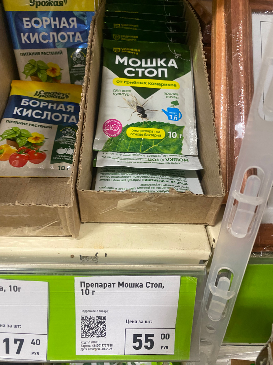 Только похвасталась что нет мошки, а она тут как тут, так вот хотела «гром» купить , но не было, купила вот это средство «Мошка стоп», но и про золу помню , что вы писали, и её достану из печки в бане, так как этого средства хорошо если на один горшок с цветком хватит, а цена хорошая .
