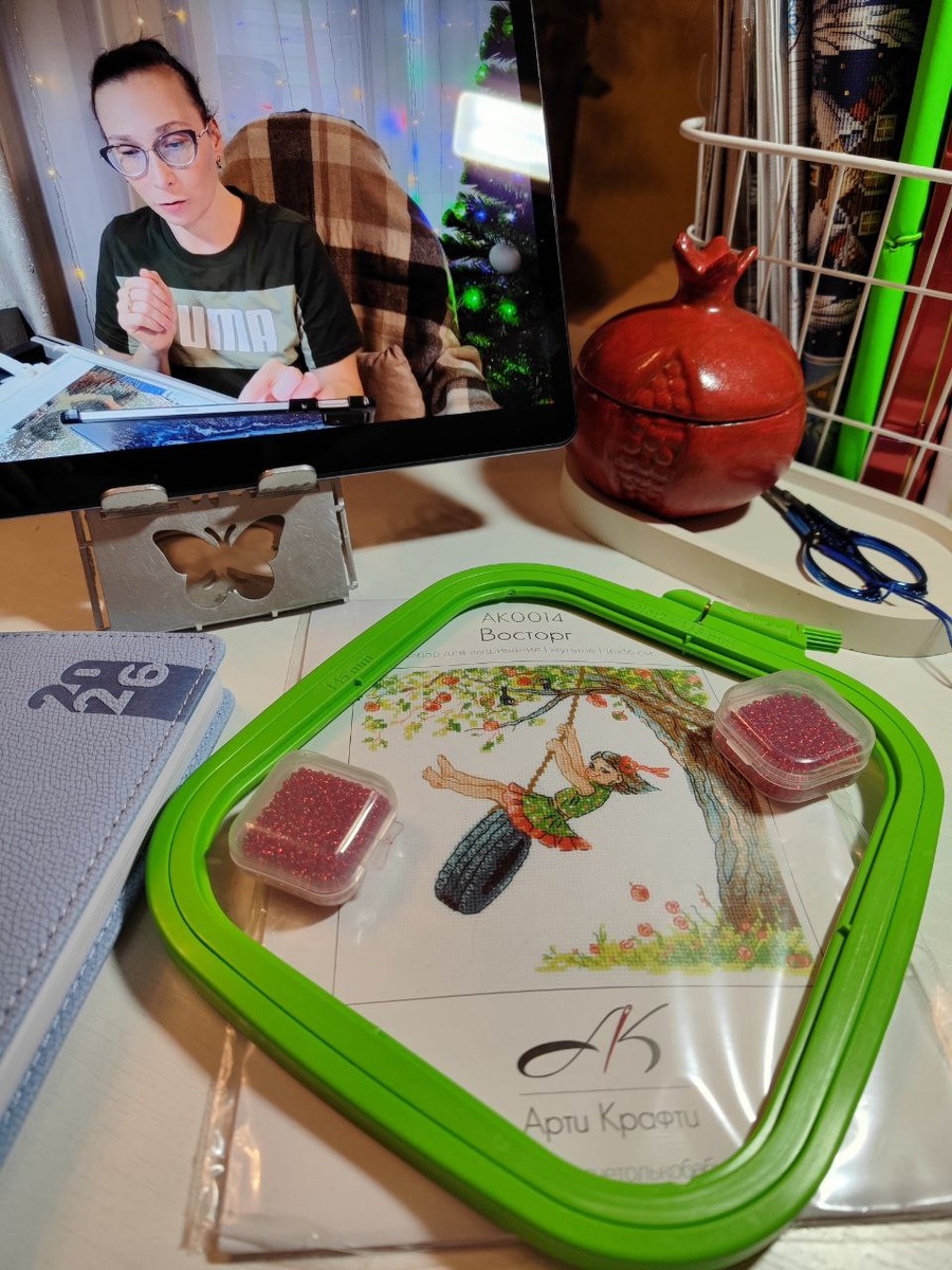 ! Полная ассоциация с моим внутренним ребенком или мной из прошлого... До сих пор я обожаю качели, этот полёт и ветер в волосах, яблоки тоже люблю, но правда только визуально, одни из красивейших фруктов для меня, к их вкусу дышу ровно. Решила в этот процесс добавить красный бисер как раз в яблочки. В общем всё готово к старту, дело за малым ⭐ Заметили хэштег на обложке набора? 🤍