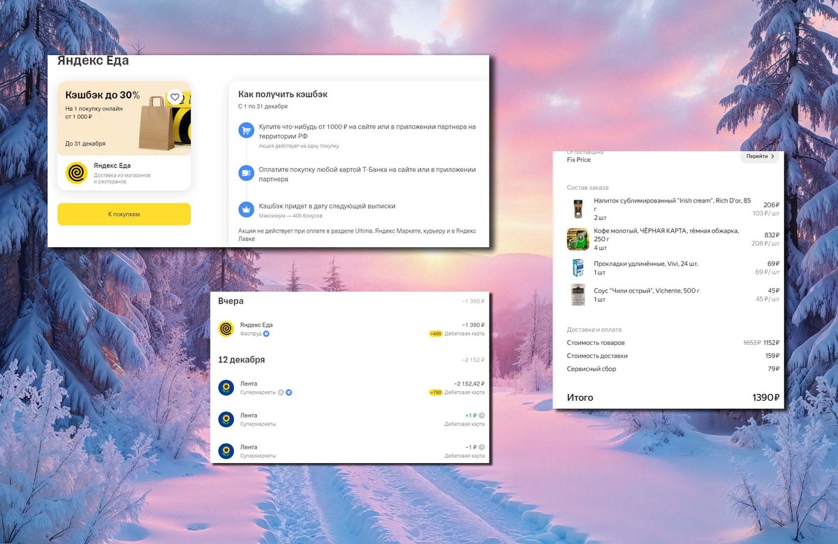 Например, в декабре самые выгодные предложения по кэшбэку – 30% кэшбэка в Яндекс Еде и 42% в Ленте. В январе пока что имеем по 15% в Чижике, Перекрестке, Магните, 20% в Самокате, но в любой момент может появиться что-то новое. Хотя 15% кэшбэка – это не то, чтоб очень много, но если при этом вы получаете 30% скидку на покупку, то в сумме уже будет более 40%.