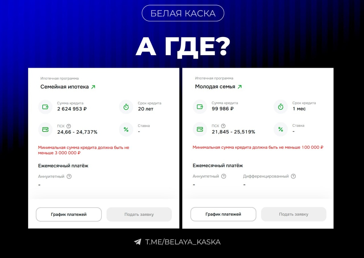 Telegram-каналы сообщают, что банк остановил прием всех заявок и подписание договоров по данным программам. На деле же, как подметил Brain Offshore, все дело в неверно выставленных лимитах, которые делают кнопку некликабельной. Некоторые источники также сообщают, что ограничения коснулись и «Семейной ипотеки». Но мы с таким не столкнулись, даже со случайно выбранными значениями. По всем программам до сих пор можно заказать звонок для консультации с банком.
