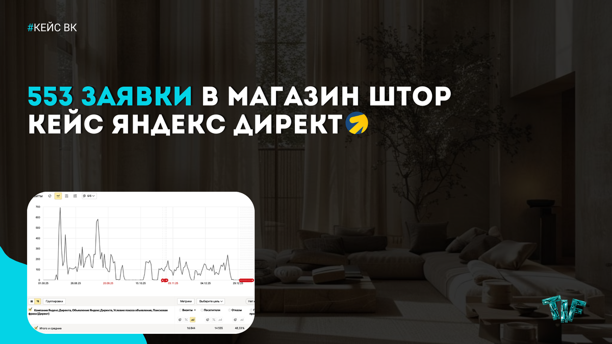 Как за год работы мы превратили безрезультатные рекламные попытки магазина штор в отлаженный механизм, который теперь предсказуемо приводит 80+ качественных заявок в месяц! ━━━━━━━━━━━━ Я – Артём Сафронов, маркетолог с опытом 4 года и владелец маркетингового агентства TIF. Полезная информация и обсуждение маркетинга – в моем телеграм-канале . Погнали читать жирнющий кейс ! ━━━━━━━━━━━━ Перед нами стояла задача не просто «крутить рекламу», а выстроить понятный и управляемый канал привлечения клиентов. Ключевые цели: стабильный поток заявок в мессенджеры и на телефон, контроль стоимости и возможность масштабировать обороты. Мы начали с глубокого аудита. Цифры четко показали: классический «Поиск» в Директе, несмотря на качественный трафик, в этой нише слишком дорогой и неэффективный по стоимости заявки. Наше первое важное решение - сместить фокус и основной бюджет в Рекламную сеть Яндекс (РСЯ). Мы сделали ставку на показ рекламы не только тем, кто ищет «шторы», но и тем, кто читает пр