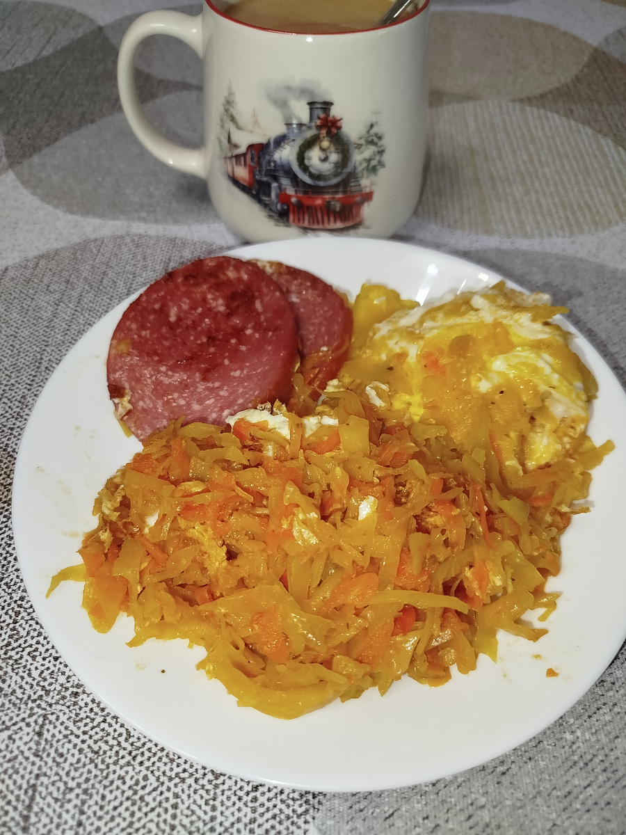 Завтрак: 2 кусочка колбасы, 2 мелких яйца и тушеная капуста. Натуральный кофе с молоком.