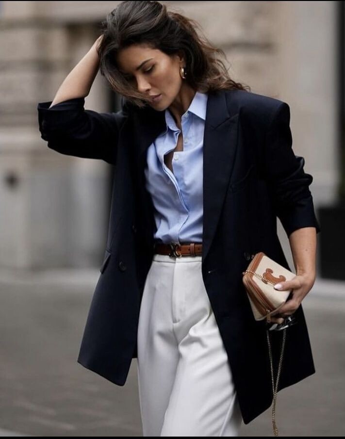 - Пиджак/блейзер. Не строгий офисный, а слегка расслабленного кроя, возможно, с закатанными рукавами. Твид, шерсть, лен.