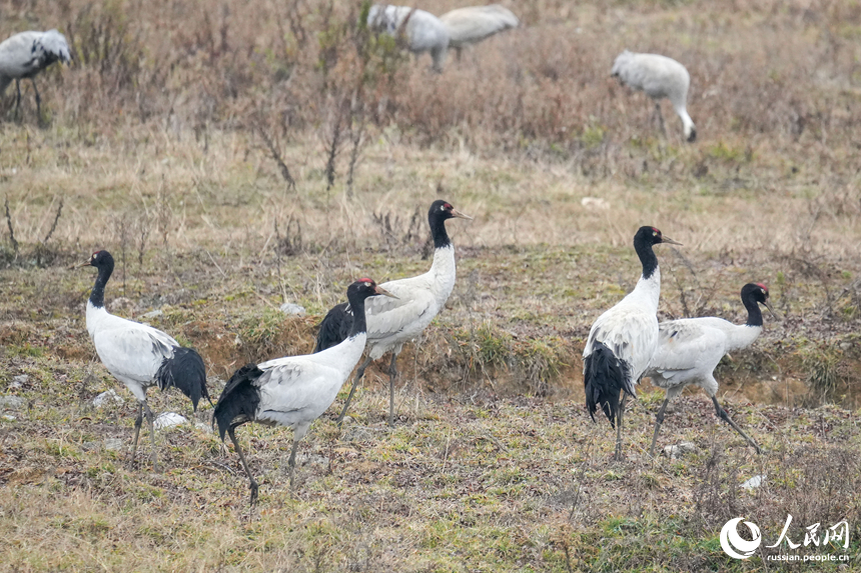 В китайском заповеднике Цаохай зимует рекордное количество черношейных журавлей