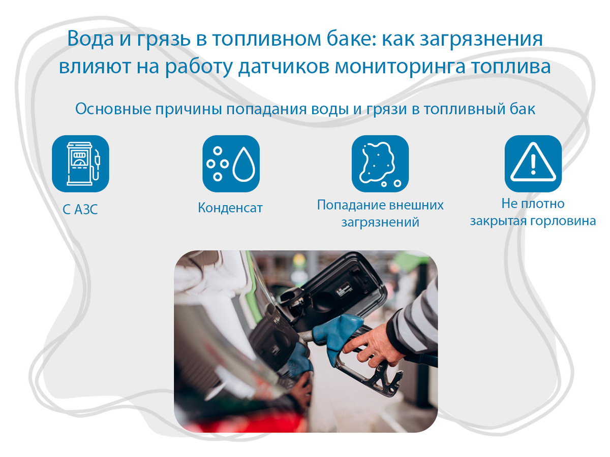 Загрязнение топливного бака часто воспринимается как незначительная проблема, на которую можно не обращать внимания. Однако на практике вода и грязь в баке напрямую влияют на корректность работы датчиков уровня топлива, систему подачи и общее состояние двигателя. Даже небольшие примеси способны нарушить точность измерений и привести к серьезным техническим последствиям. Существует несколько распространенных причин загрязнения: Вода тяжелее топлива, поэтому она скапливается на дне бака. Это приводит к ряду проблем: Грязевые отложения со временем накапливаются в нижней части бака и: Игнорирование загрязнений может вызвать: Вода и грязь в топливном баке - это не просто неудобство, а фактор, напрямую влияющий на точность контроля топлива, надежность техники и затраты на обслуживание. Регулярная профилактика и контроль состояния топливной системы позволяют избежать серьезных проблем в будущем. Подробнее о причинах и последствиях загрязнений можно прочитать в статье.