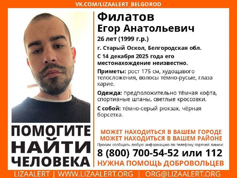 ! Филатов Егор Анатольевич, 26 лет. г. Старый Оскол. Белгородская обл. С 14 декабря 2025 года его местонахождение неизвестно. Если вы обладаете какой-либо информацией о пропавшем, просьба позвонить по номеру телефона горячей линии отряда 88007005452 (бесплатно по РФ) или 112. ❕ Жесть Белгород - подписаться