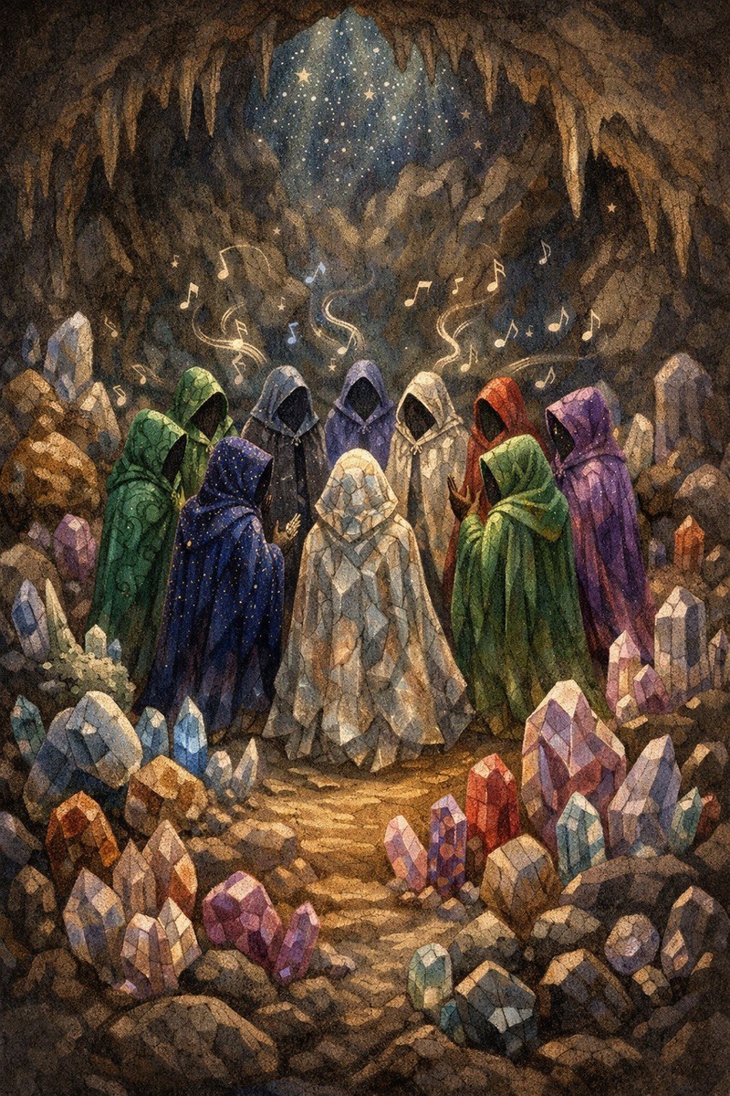 Они сходятся из пещер и гор, из русел рек и глубин земли, из холодных перевалов и тёплых долин. Старые и молодые, прозрачные и плотные, светящиеся и матовые — все приходят, укутанные в свои плащи, отражающие их истинную природу: прожилки, слои, трещины, сияние и глубину.