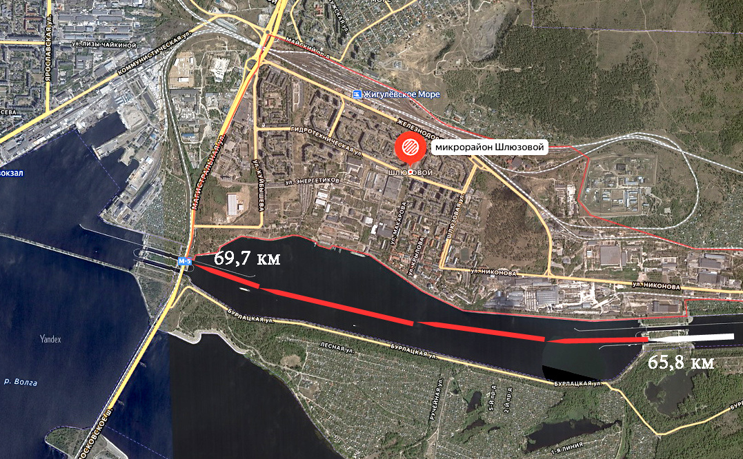 В предыдущей статье наш теплоход через шлюз №24 из нижнего бьефа Жигулёвского гидроузла перешёл в межшлюзовый (промежуточный, разделительный) бьеф, он же судоходный канал №33. Бьеф, как и нижний подходный канал, с севера ограничен левым берегом Волги, с юга – полуостровом Копылово. Полуостров – это городская зона отдыха, на левом берегу вдоль межшлюзового бьефа расположен микрорайон Шлюзовой Комсомольского района (к этому району относится и полуостров) города Тольятти. Вид на верхний подход нижних шлюзов гидроузла, в центе кадра – причальная стенка, уходящая к верхней голове шлюза №24. Примерно 1,3 километра территории к западу от шлюзов №№23/24 на северном берегу бьефа (на снимке слева) занимает крупное современное предприятие «Лада-Лист» – крупнейший производитель листового пластика в России. Сразу за заводом начинается жилой массив, который тянется по берегу на 1 километр. В этом кадре жилой массив уместился полностью, и здания, которые видны на снимке, расположены на улице Носова.