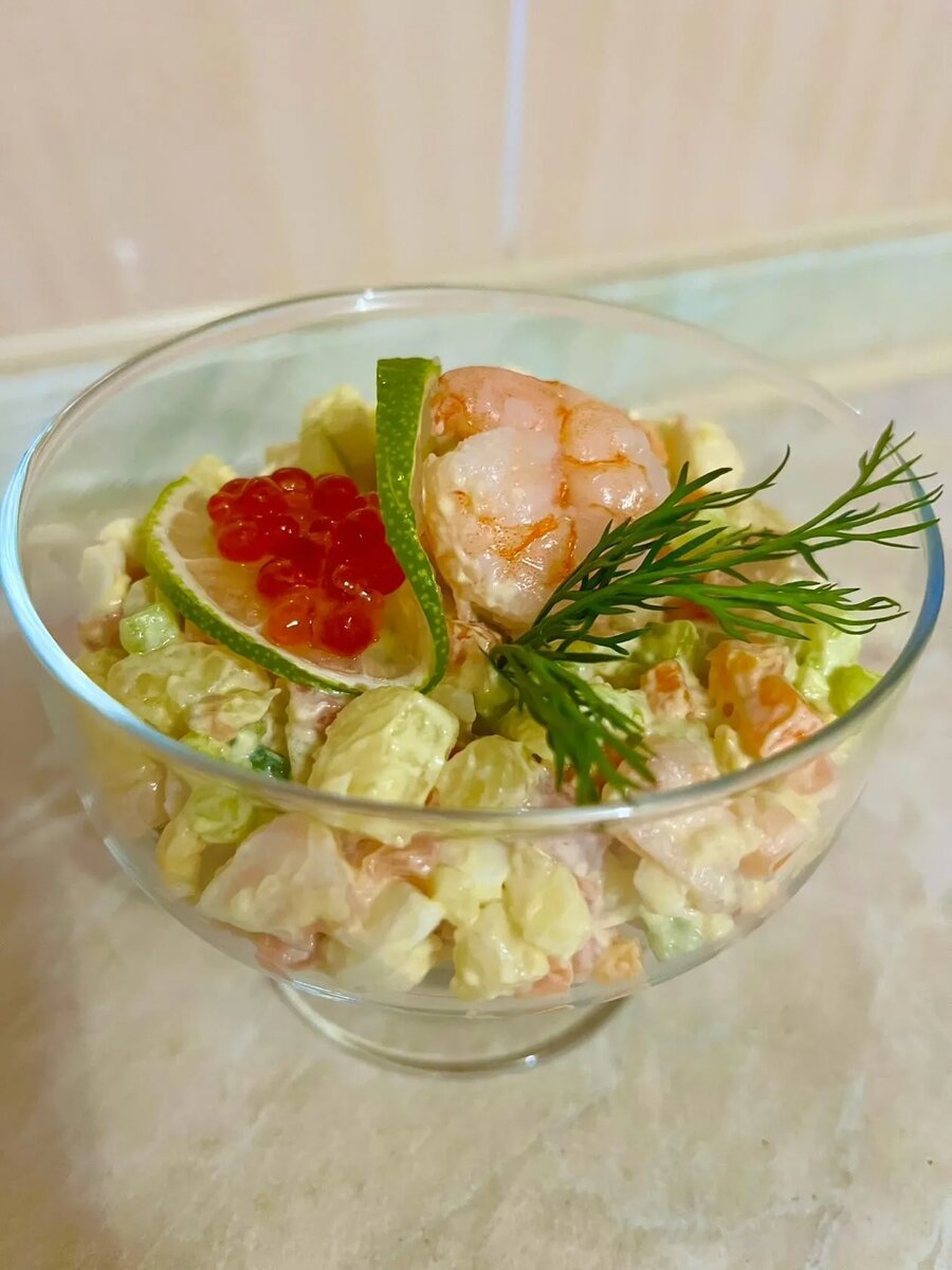 Оливье по-скандинавски с креветкой и красной рыбкой