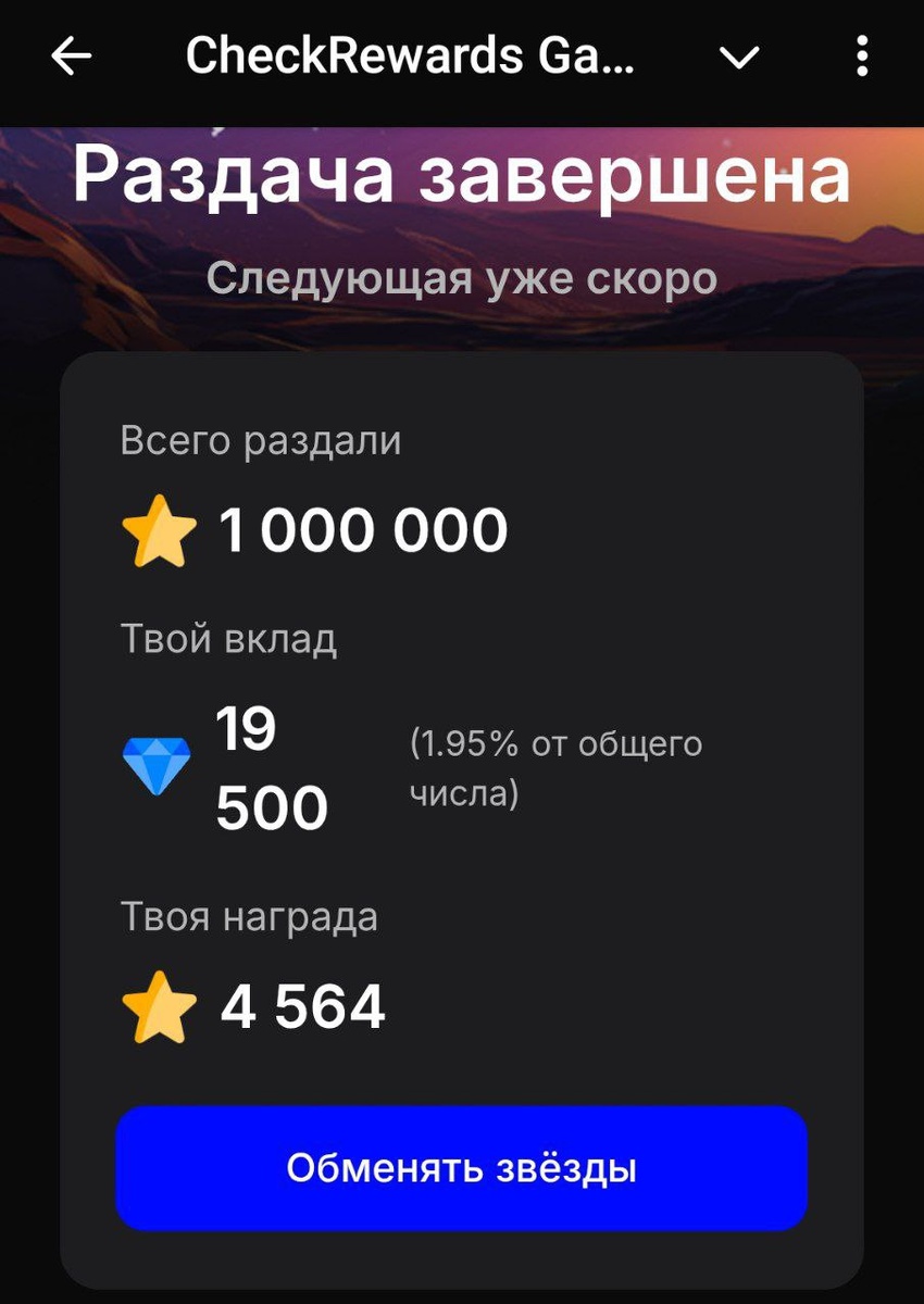 Мой результат: -занял 42 место -получил 4564 звезды - отправил на обмен получилось 91.28 $ И это без вложений🔥 Кто участвовал присылайте свои результаты🔥 В ближайшее время будет стартовать еще одна раздача. О ней сообщу позже. Если быть честным - я не доволен. Ожидал около 200$, получил в 2 раза меньше. (Для сравнения в предыдущей раздаче получил почти столько же $, но там было 8к 💎, а здесь внесено 19.5к💎 Теперь топы занимают "донатеры", в игре пропадает постепенно шанс заработать без вложений. Поглядим что будет дальше.... 💬 Чат | ⚠️ Риски